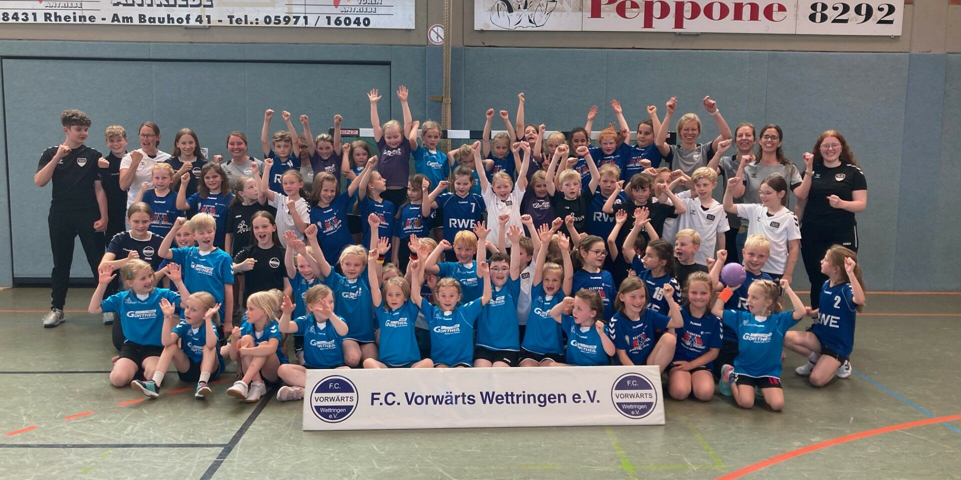 6 Teams aus Wettringen und 3 Teams aus Neuenkirchen zeigten großen Einsatz und warfen viele Tore. Angefeuert wurden sie von zahlreichen Zuschauern in der Ludgerushalle.