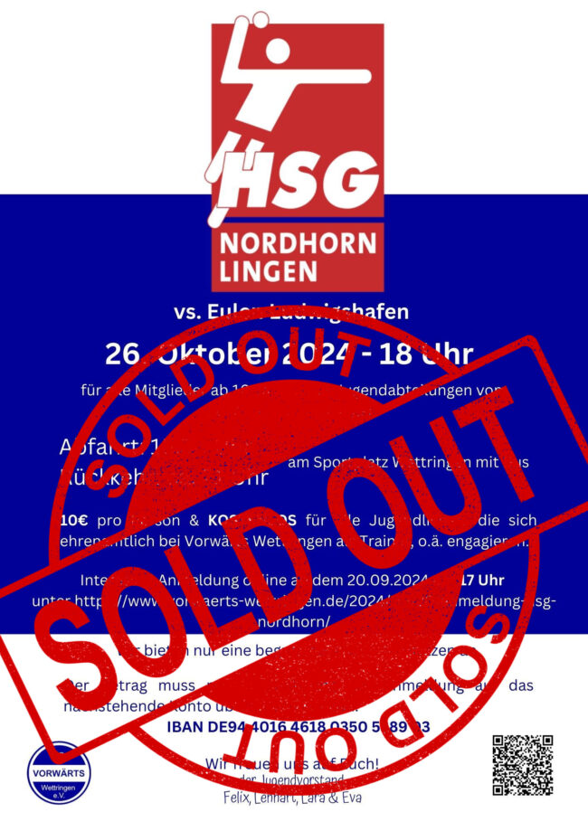 Handballausflug zum Spiel HSG Nordhorn-Lingen vs. Eulen Ludwigshafen Der FC Vorwärts Wettringen lädt seine Jugendmitglieder zu einem spannenden Handballspiel der HSG Nordhorn-Lingen gegen die Eulen Ludwigshafen ein! Die Fahrt findet am 26. Oktober 2024 statt und bietet die perfekte Gelegenheit, Handball-Action hautnah mitzuerleben. Details zum Ausflug: – Datum und Uhrzeit: 26. Oktober 2024, 18 Uhr…