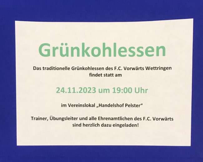 Liebe Trainer, Übungsleiter und alle Ehrenamtlichen des F.C. Vorwärts, das traditionelle Grünkohlessen des F.C. Vorwärts Wettringen findet statt am 24.11.2023 um 19:00 Uhr im Vereinslokal „Handelshof Pelster“.