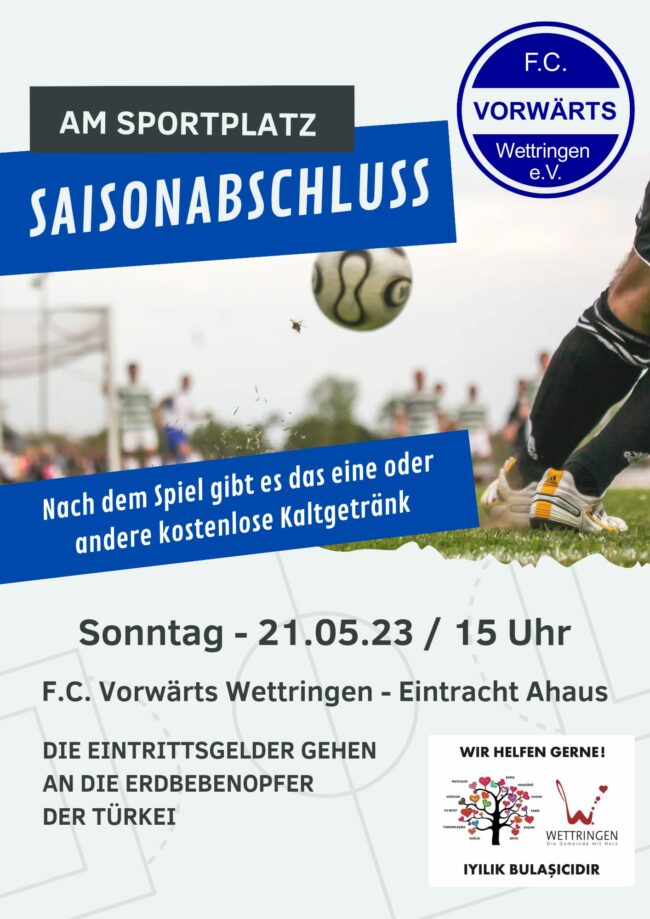Am 21.05.2023 findet am Sportplatz ab 15 Uhr der Saisonabschluss der Fußballabteilung statt.