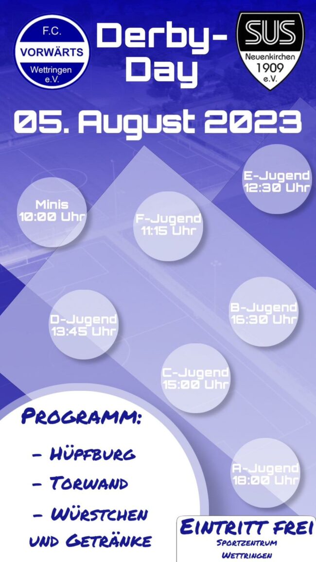 Am 05.08.2023 findet ab 10 Uhr auf dem Sportgelände des F.C. Vorwärts Wettringen e.V. der Derby-Day der Fußballjugend statt.