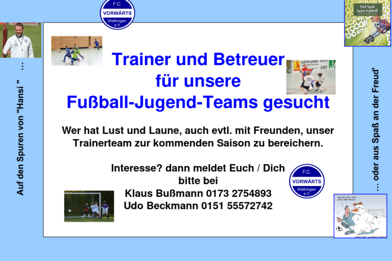 Trainer und Betreuer gesucht! Für die kommende Saison suchen wir noch Trainer und Betreuer für unsere Fußball-Jugend-Teams. Bei Interesse gerne bei Klaus Bußmann (0173 2754893) oder Udo Beckmann (0151 55572742) melden!